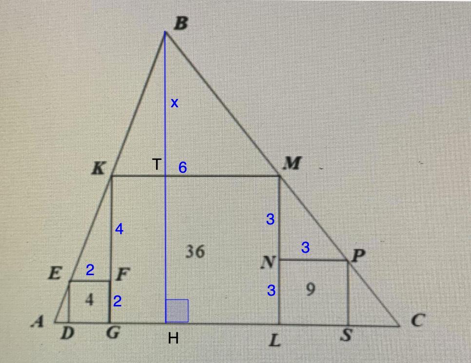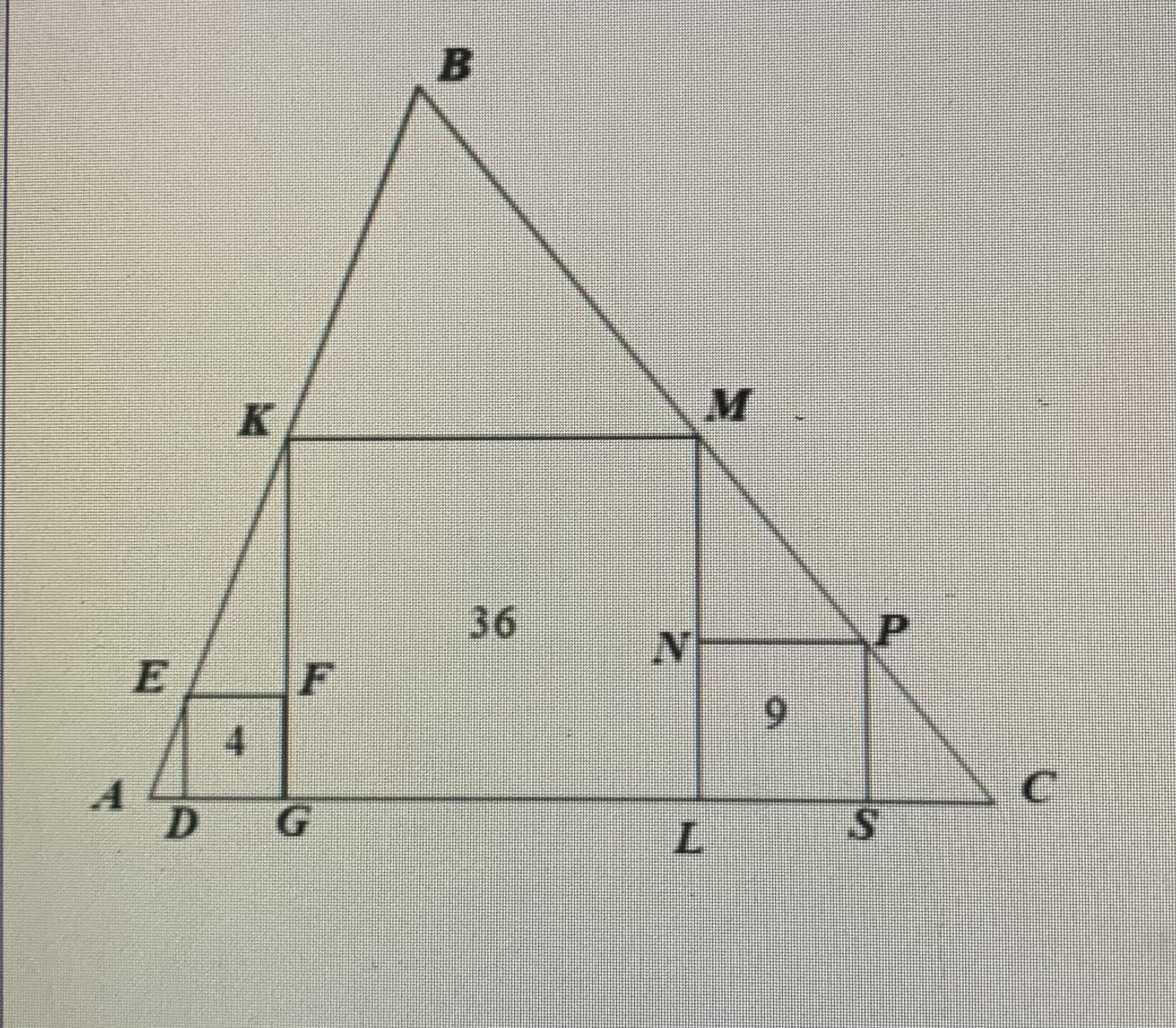 В треугольнике ABC расположено три квадрата DEFG, GKML, LNPS площадью 4,36 и 9 соответственно. Площадь треугольника ABC равна…