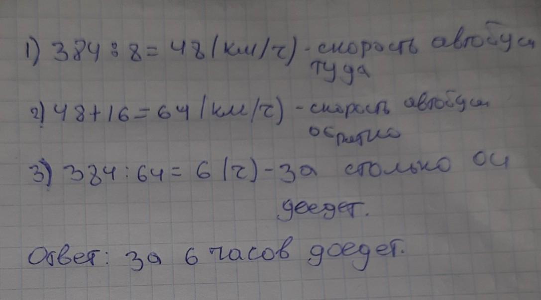 cкорость автобуса 384/8=48/км/ч/, тогда увеличенная скорость на 16км/ч, составит 48+16=64/км/ч/, и на обратный путь автобус потратит времени 384/64=6/ч/