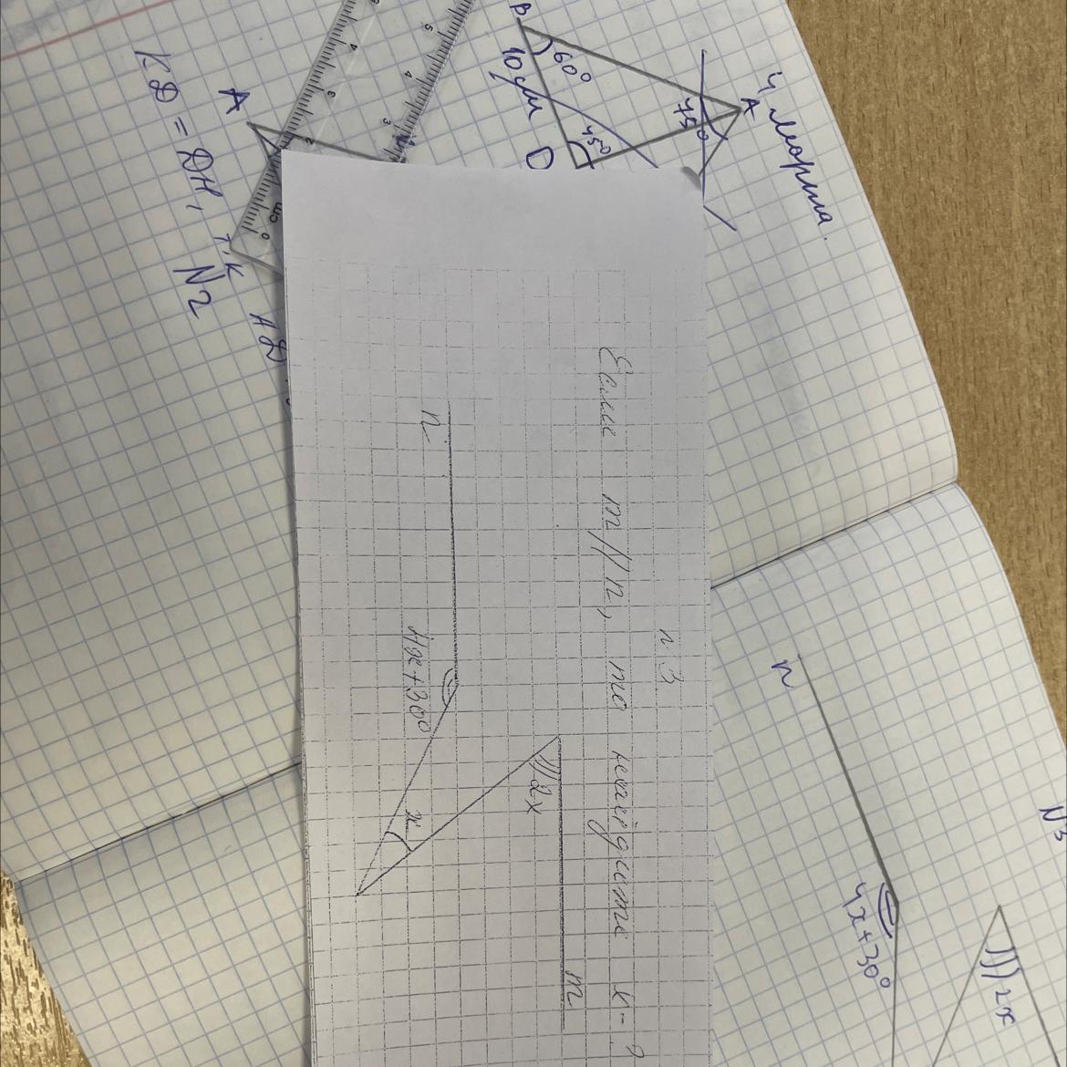 Объяснение: если провести прямую, паралелльной m,то она будет параллельна и n, то угол 2х будео равен х+х как накрестлежащие. Т.к. прямая h параллельна n, то 4х+30+2х=180 как односторонние. Из этого х равен 30