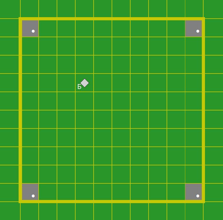 Робот стоит где-то внутри поля. Он должен закрасить клетки в углах поля и вернуться в начальную точку. Используйте переменные.