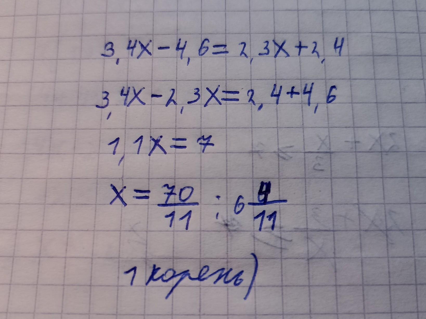 Сколько корней имеет данное уравнение 3,4x - 4,6=2,3x+2,4 ? ПОЖАЛУЙСТА СКАЖИТЕ