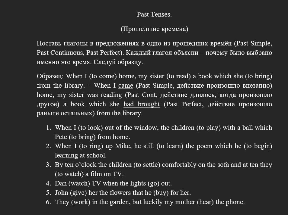 1. When I looked (Past Simple, единичное действие в прошлом) out of the window, the children were playing (Past Continuous, действие длилось, когда произошло другое) with a ball which Pete had brought (Past Perfect, действие произошло раньше остальных) from home.