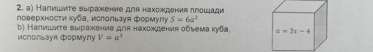 2. а) Напишите выражение для нахождения площади поверхности куба, используя формулу S ба b) Напишите выражение для нахождения объема куба, используя формулу V = a СРОЧНООО!!!!!