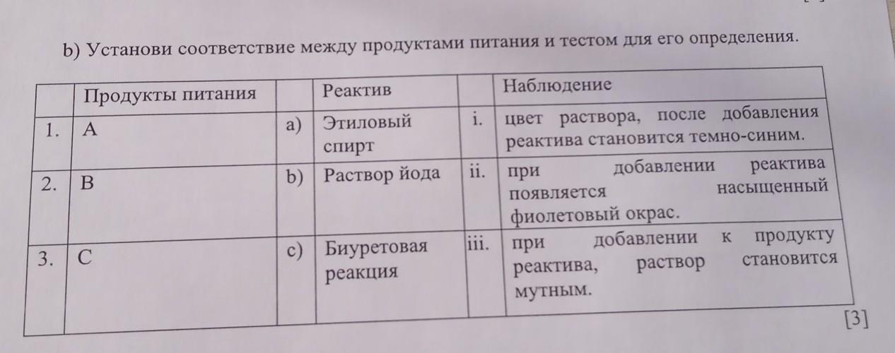 Наблюдение реактива насыщенный становится добавлении к продукту раствор при добавлении при появляется фиолетовый окрас 11. peaктива, мутным. цвет раствора, после добавления реактива становится темно-синим. b) Установи соответствие между продуктами питания и тестом для его определения. Раствор йода Реактив c) Биуретовая реакция b) a) Этиловый спирт C 3. Продукты питания B 2. A 1.