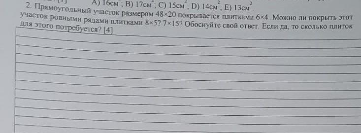 прямоугольный участок размером 48×20 покрывается плитками 6×4. Можно ли покрыть этот участок ровными рядами плитками 8×5? 7×15? обоснуйте свой ответ. если да, то сколько плиток для этого потребуется?