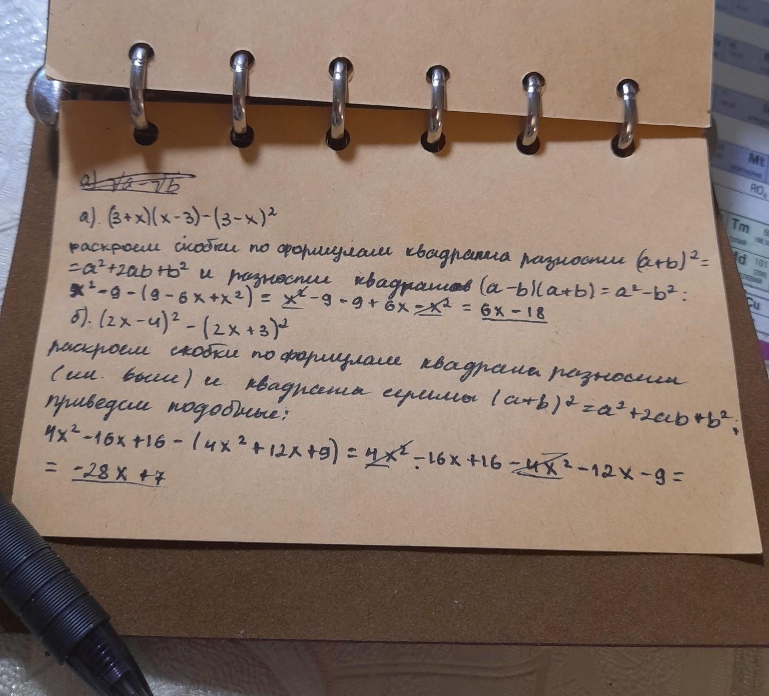 преобразовать выражение в многочлен стандартного вида а(3+x)(x-3)-(3-x)^2 б(2x-4)^2-(2x+3)^2 пожалуйста