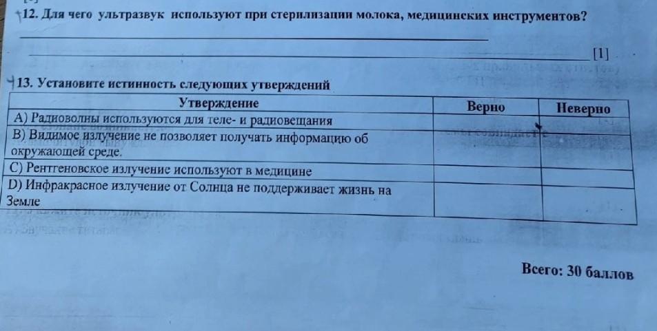 Установите истинность следующих утверждений Утверждение А) Радиоволны используются для теле-и радиовещания В) Видимое излучение не позволяет получать информацию об окружающей среде. С) Рентгеновское излучение используют в медицине D) Инфракрасное излучение от Солнца не поддерживает жизнь на Земле Всего: