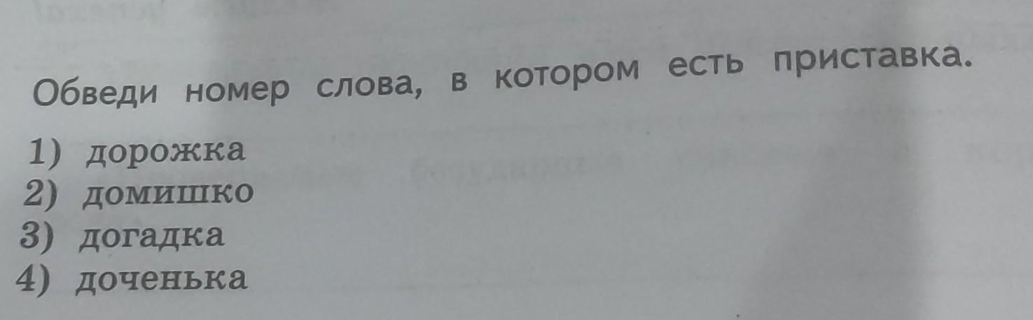 4. Обведи номер слова, в котором есть приставка. 1) дорожка 2) домишко 3) догадка 4) доченька ИБ пж срочно