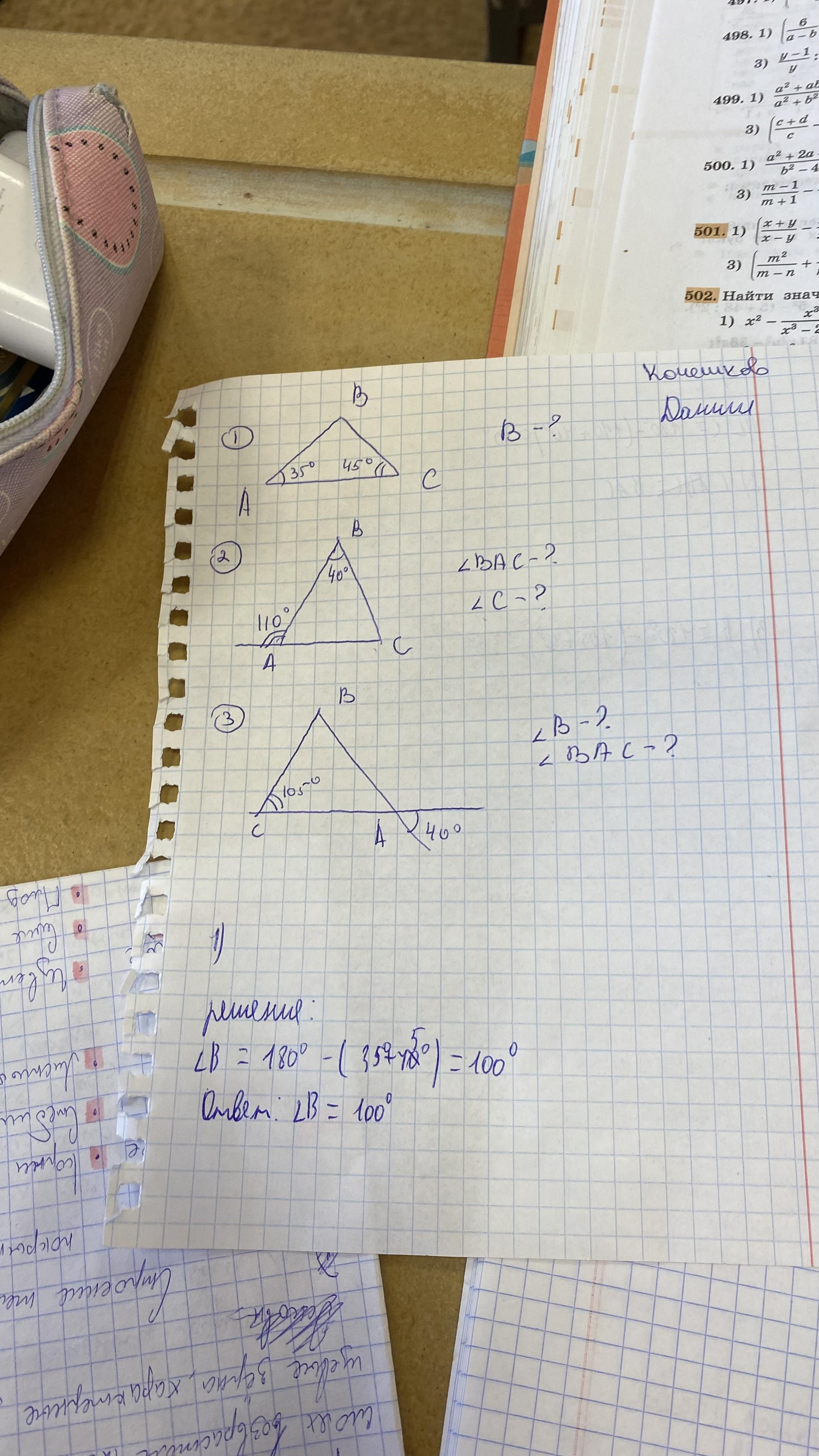 Смежный угол равен сумме двух других углов не смежных с ним.