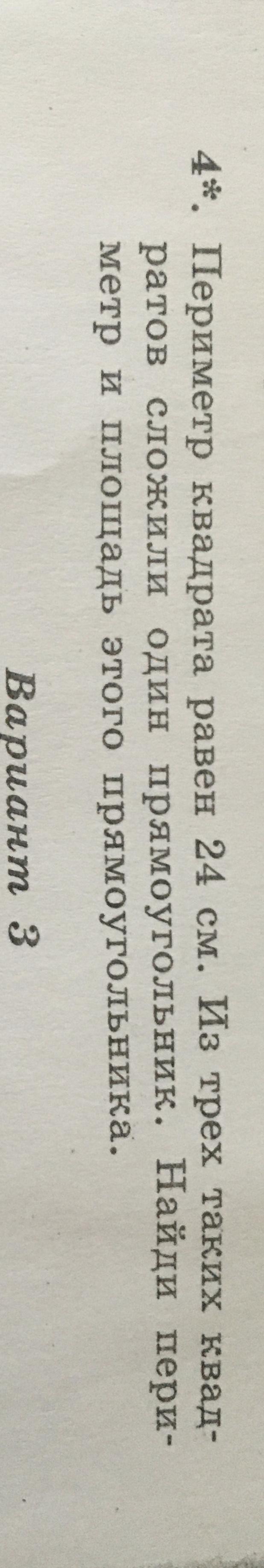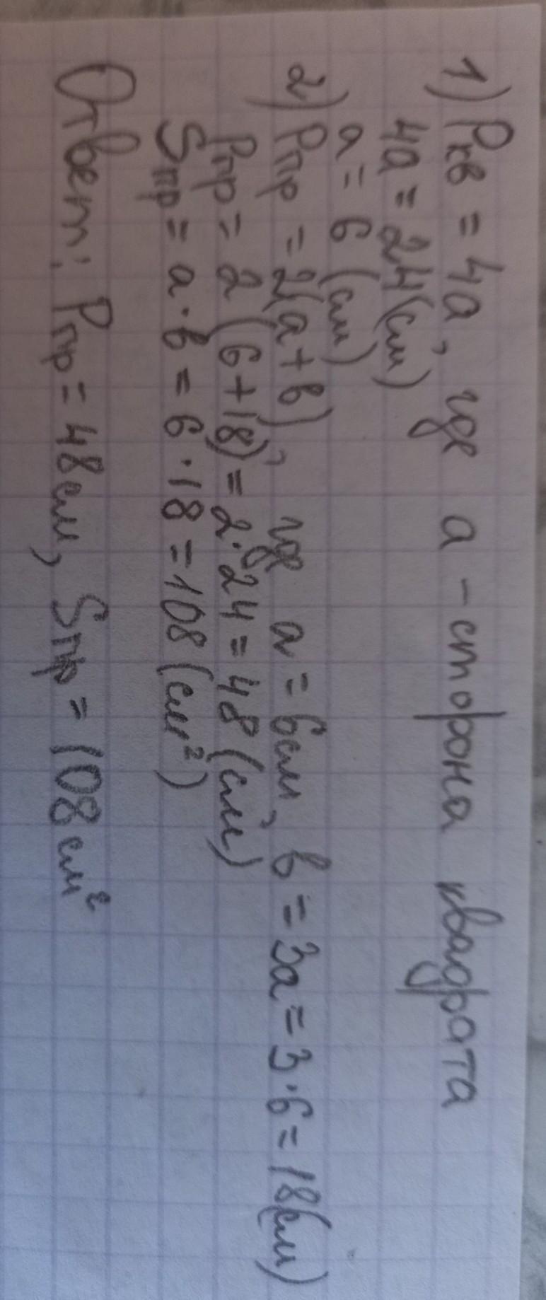 Периметр квадрата равен 24см. Из трёх таких квадратратов сложили один прямоугольник. Найди периметр и площадь этого прямоугольника.