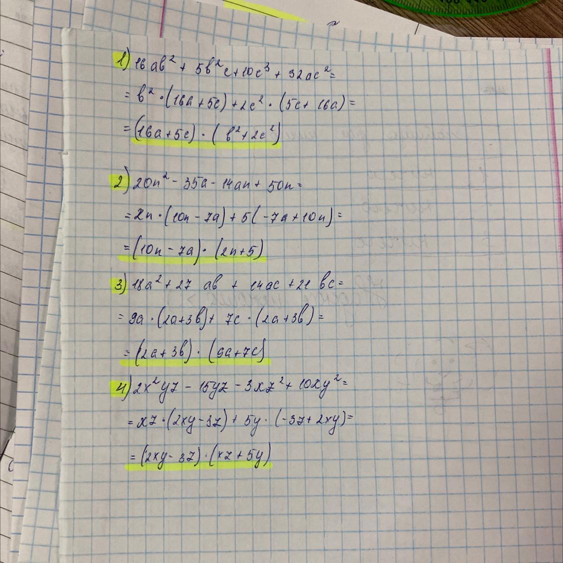 в) 18a²+27ab+14ac+21bc= 9a(2a+3b)+7c(2a+3b)= (2a+3b)(9a+7c)