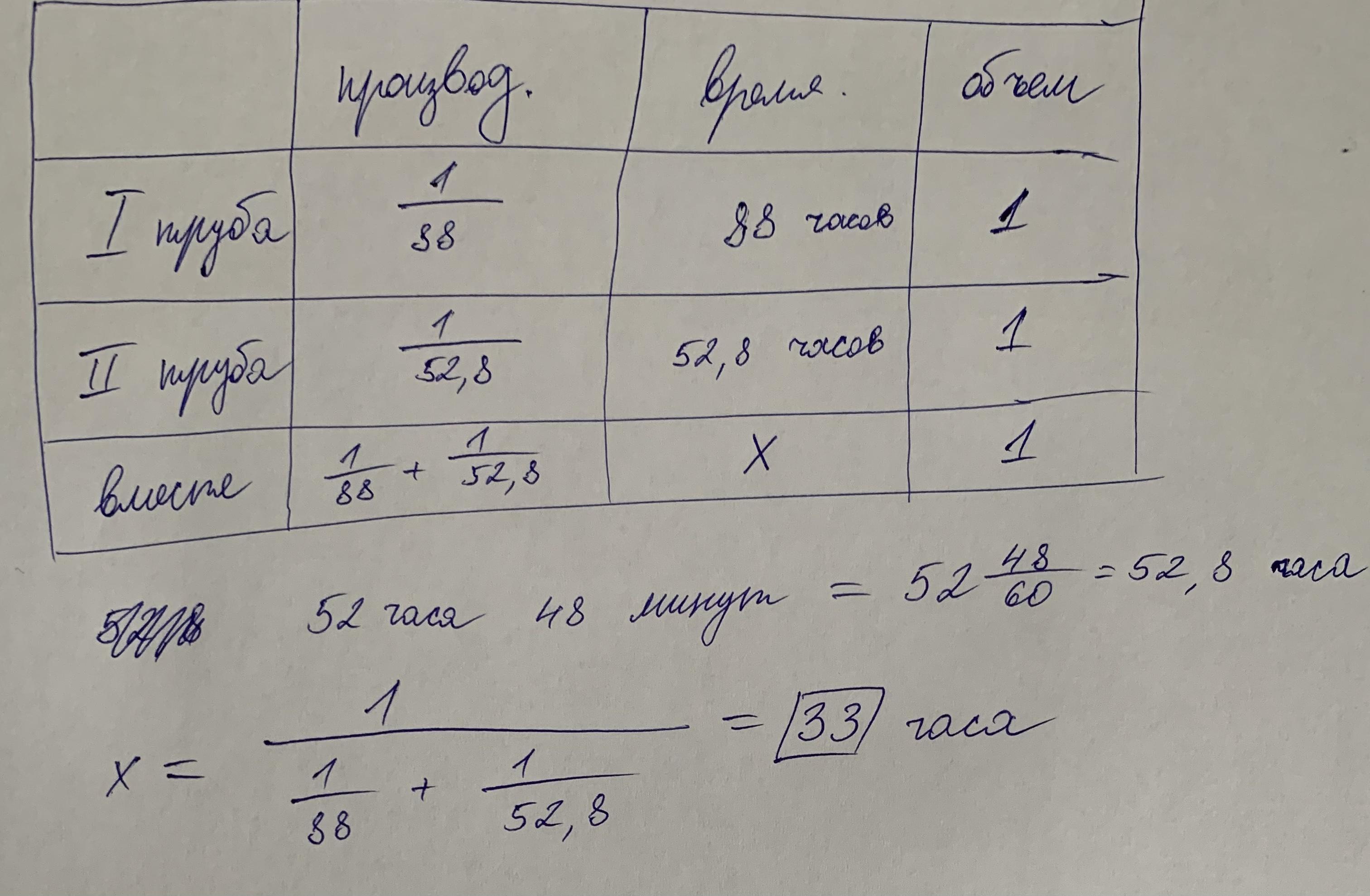 одна труба наполняет бассейн за 88 часов другая за 52 часа 48 минут. За какое время они наполнят бассейн если будут работать обе трубы