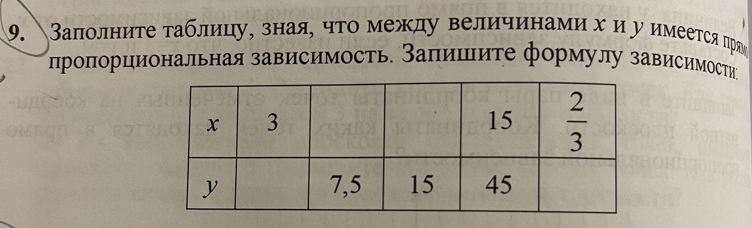 Заполните таблицу, зная , что между величинами x и y имеется прямо пропорциональная зависимость. Запишите формулу зависимости: