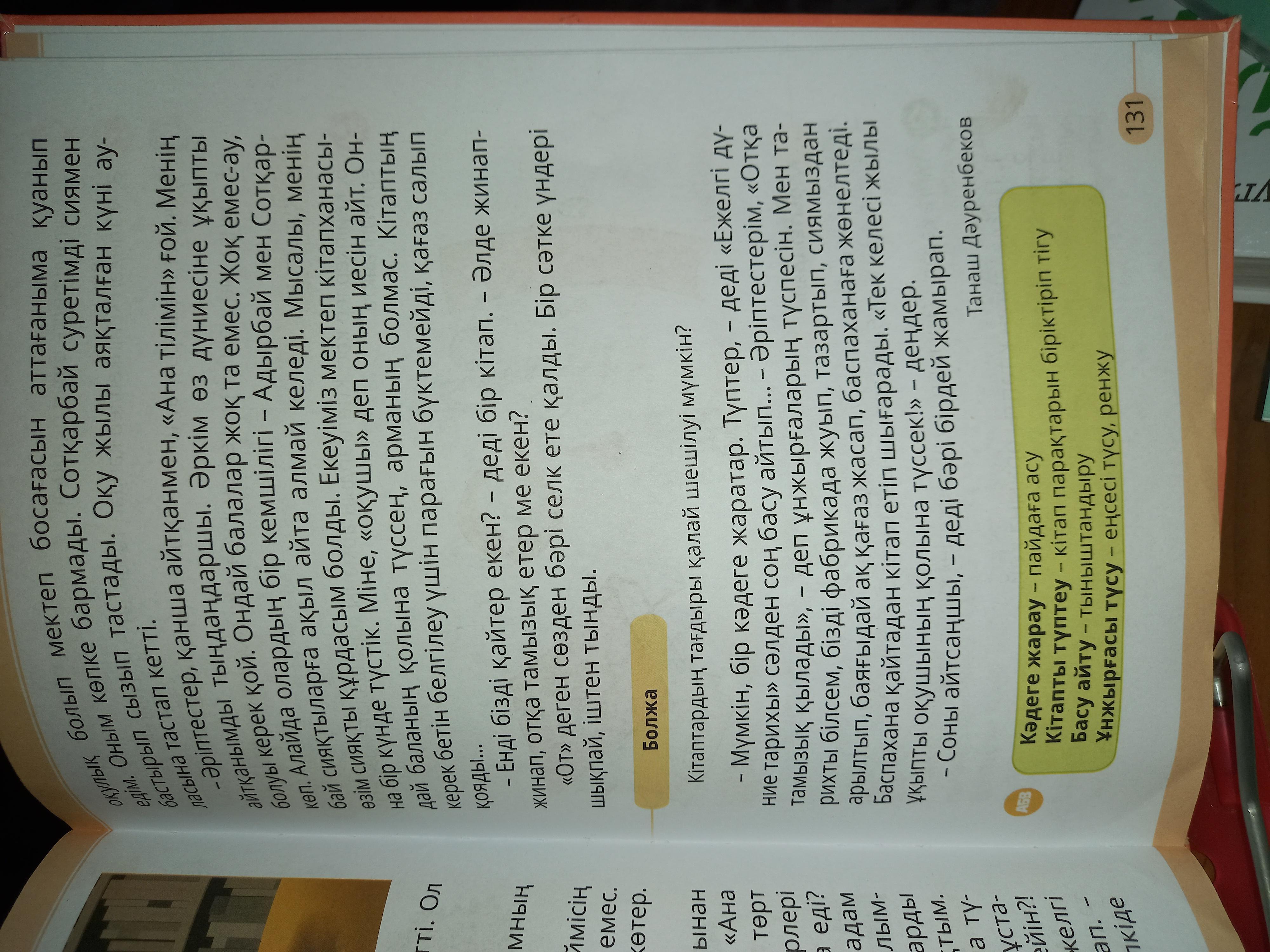 бара жатырды. Бірақ Ана тілін Әділбек деген ағай құлап бара жатқан жерінен бір қолымен ұстап қалды. Екінші қолындағы кітаптар жерге шашышлып қалуға қалды, бірақ ақыры шашылмады. Ана тілі кітабы жерге тарс етіп түскенде, кітаптың парша паршасы шығатын еді. Ана тілі кітакітап уфф деп демін алды. Әділбек ағай Ежелгі Дүние Тарихы мен Ана тілінің халдерін көріп шошып кетті. Себебі ол кітап оқығанды өте сүйетін адам еді.
