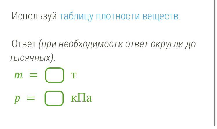 чугунная поверочная плита с координатной разметкой служит в качестве базовой плоскости для всех типов точных измерений и проверок. С ее помощью выполняется проверка точности размеров деталей оборудования. прими, что площадь основания такой плиты равна 1,5м2 , а толщина - 14 см. вычисли массу проверочной плиты и ее давления на пол.