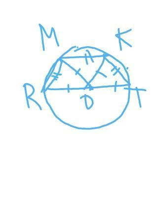 Помогите пожалуйста, очень нужно! Даю последние 28 баллов!(у меня был такой же старый вопрос, в котором я давала 50 баллов, можете посмотреть.)Прошу написать решение и желательно сделать чертёж, буду крайне благодарна! Отрезок RT - диаметр окружности с центром в точке О. На окружности отмечены точки M и К так, что хорды MR, KM и КТ равны. Найдите величину угла КОТ .