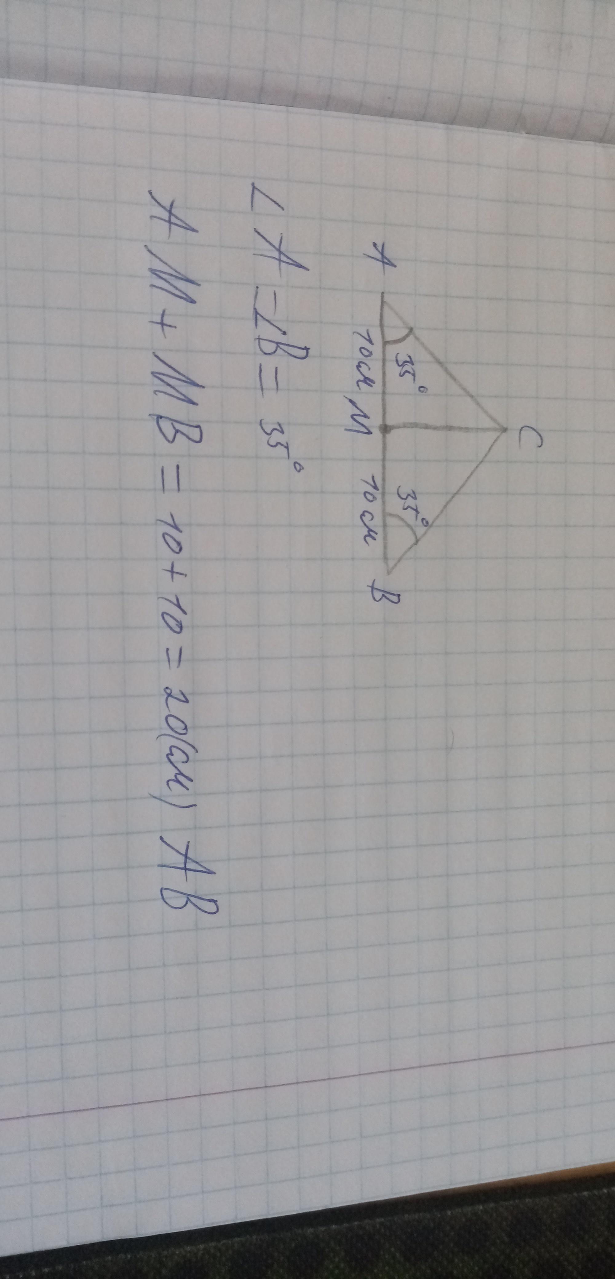 Якщо у рівнобедреному трикутнику через верхню вершину провести висоту або бісектрису то сторона навпроти поділиться на 2 відрізки. Позначаємо висоту двома точками С і М. Відрізок ВМ = 10 см, отже відрізок АВ також буде 10 см.
