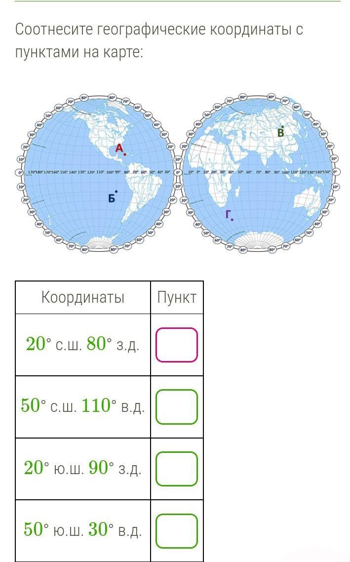 Ответ:50°с.ш80°з.д- А