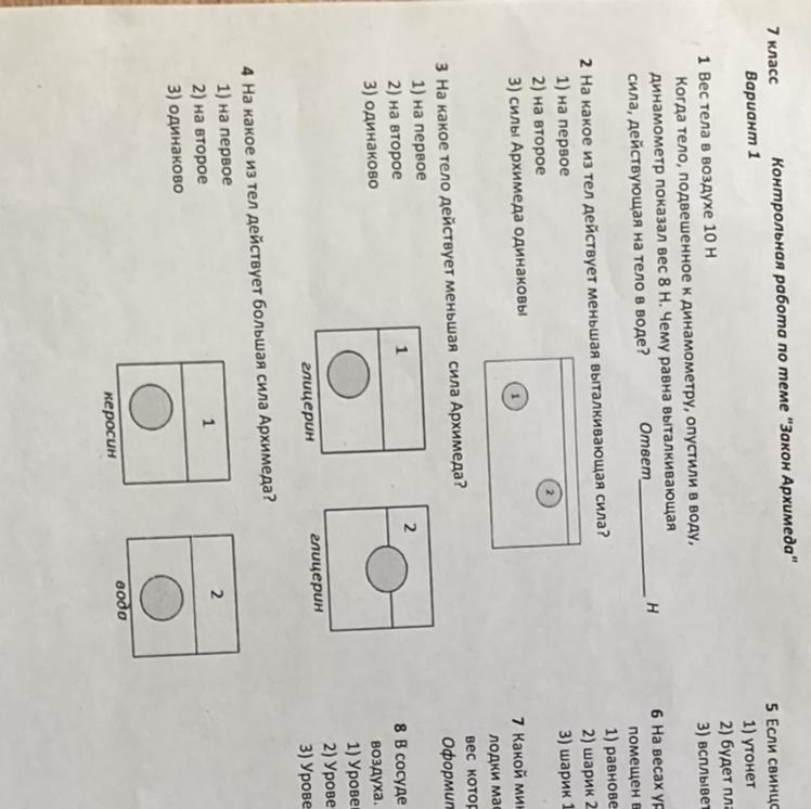 4) на первое тело, меньшая архимедова сила действует на тело которое погружено в наимение густую жыдкость то есть керосин
