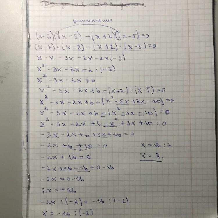 ( x - 2 ) ( x - 3 ) - ( x + 2 ) ( x - 5 ) = 0