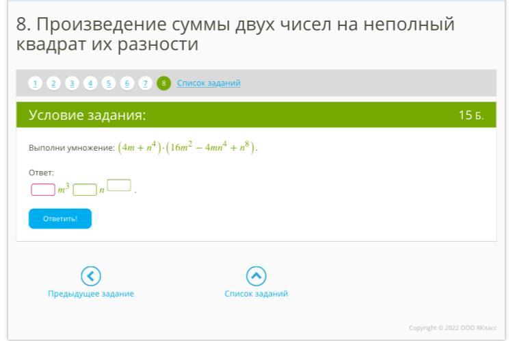 Выполни умножение: (4m+n^4)⋅(16m^2−4mn^4+n^8).