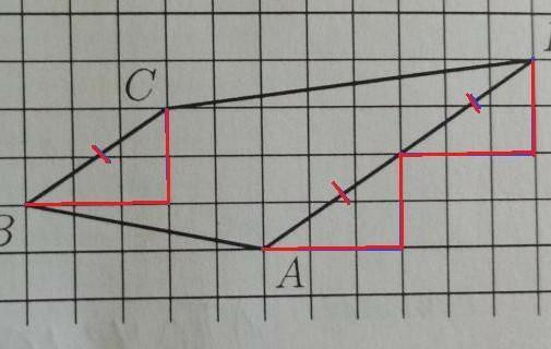 Смотри рисунок . Достроили прямоугольные треугольники с равными катетами 3 и 2 . Треугольники равные, значит и гипотенузы у них равные.