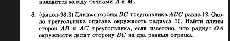 Обозначим точкой М пересечение радиуса АО с отрезком ВС. Треугольники ОМВ равен треугольнику ОМС по трем сторонам: ОМ общая, ОВ = ОС = R, BM = MC по условию. Треугольники прямоугольные, радиус является гипотенузой, а ВМ = МС = ВС/2 = 12/2 = 6