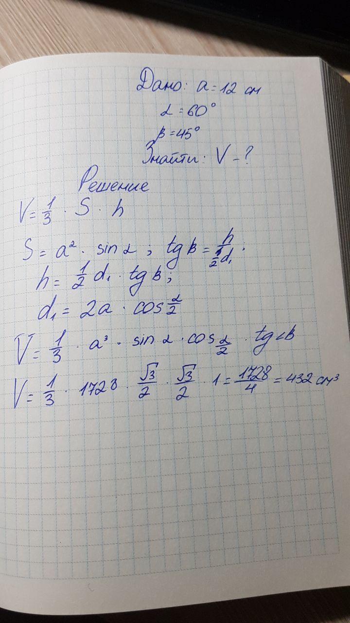 Основание пирамиды-ромб со стороной 12 см и острым углом 60 градусов. Двугранные углы при основании пирамиды равны 45 градусов. Вычислите объём пирамиды.