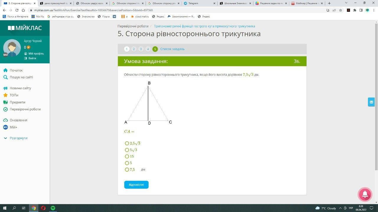 Обчисли сторону рівностороннього трикутника, якщо його висота дорівнює