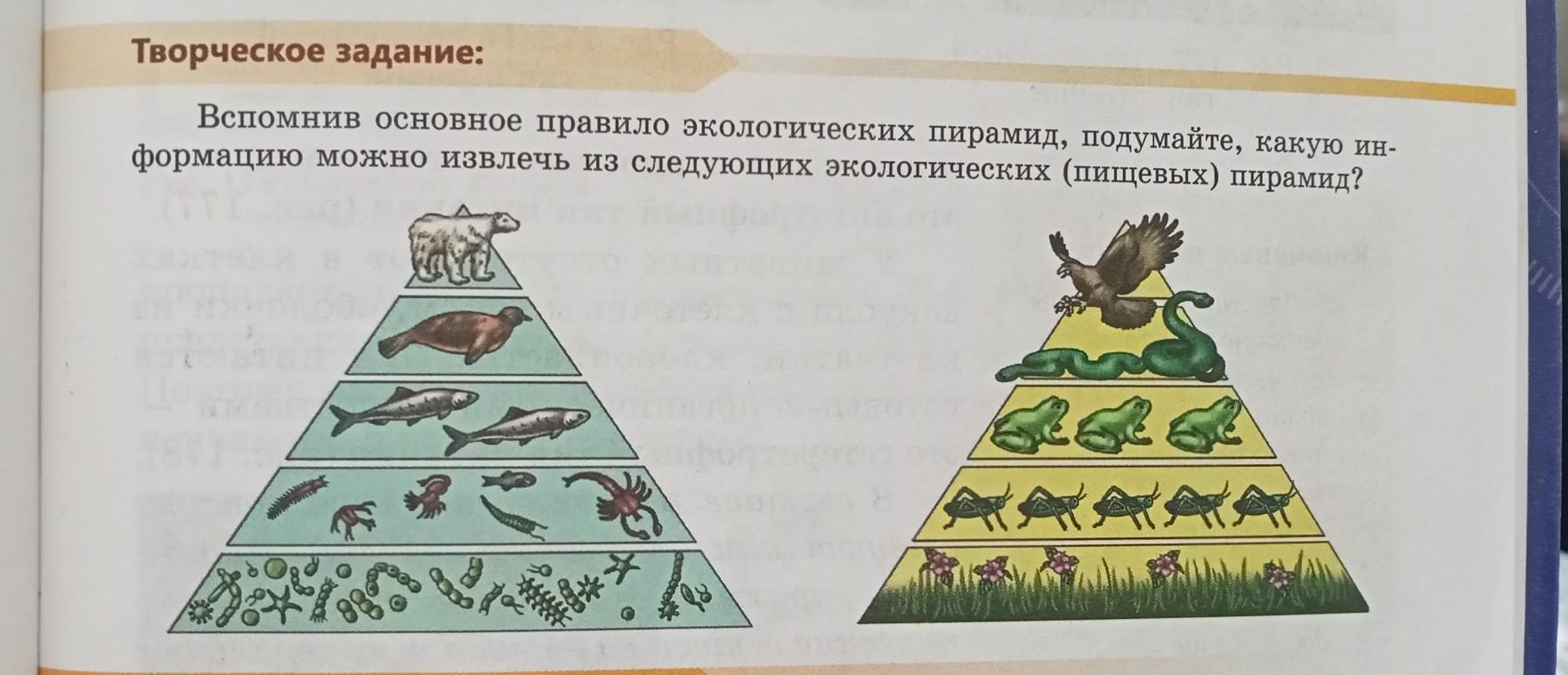 Творческое задание: Вспомнив основное правило экологических пирамид, подумайте, какую ин- формацию можно извлечь из следующих экологических (пищевых) пирамид?