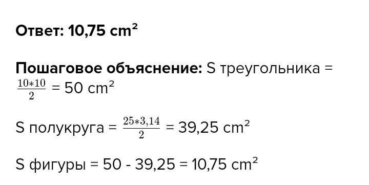 455. Из равнобедренного прямоугольного треугольника вырезали полукруг ради- усом 5 см, как показано на рисунке 114 (полуокружность касается катетов треугольника). Найди площадь остав- шейся фигуры. Катет перпенди- кулярен радиусу, проведенному в точку касания. Рисунок 114 можно побыстрей
