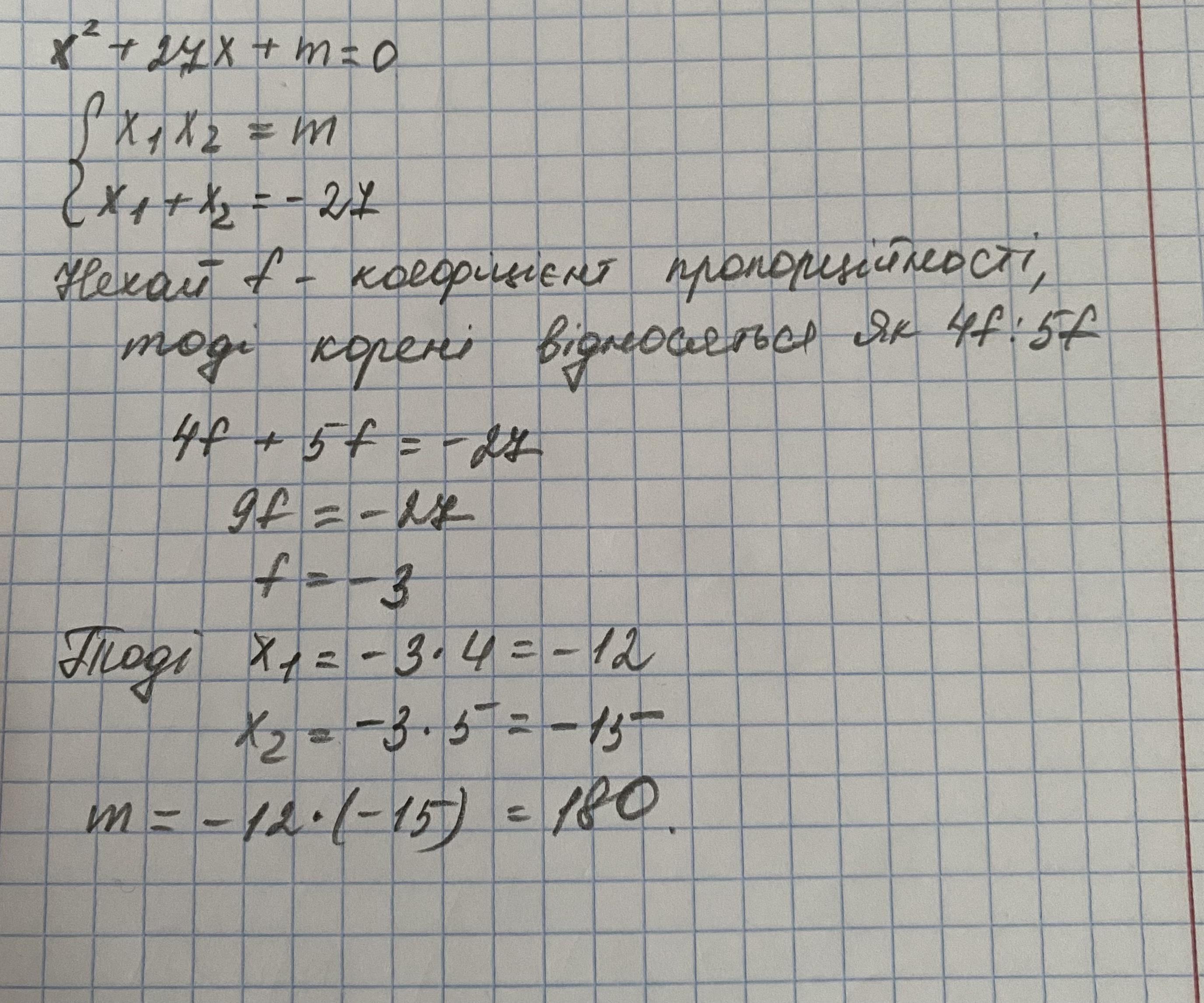 корені рівняння x²+27x+m=0 відносяться як 4:5. Знайдіть корені рівняння та значення m