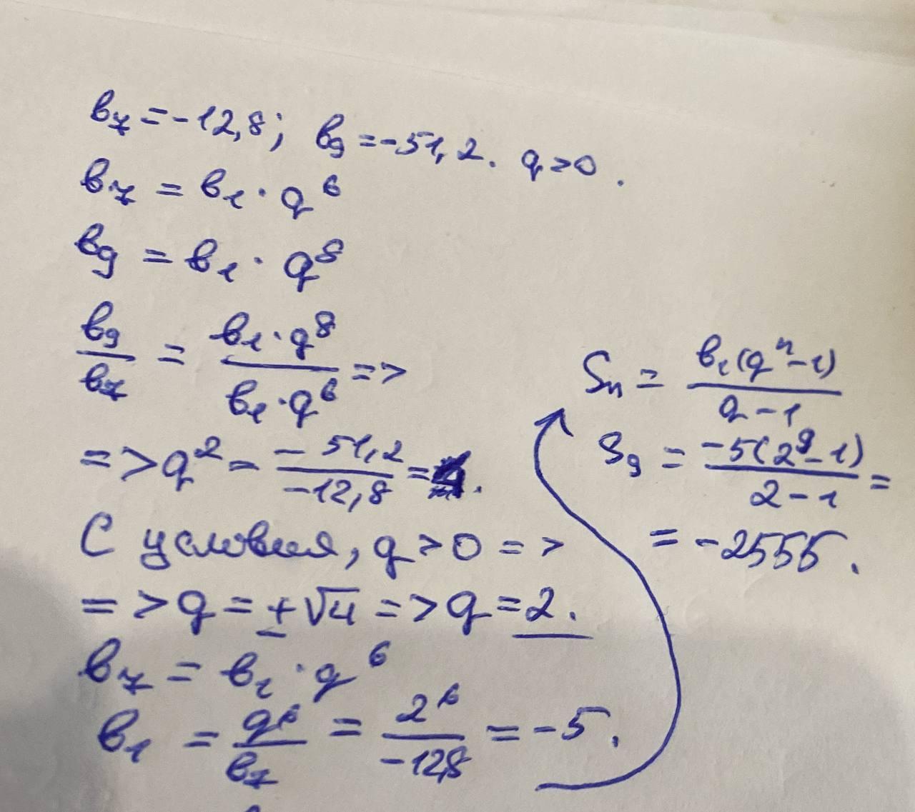 найдите сумму первых 9 членов геометрической прогрессии если b7 = -12,8 ; b9 = -51,2 ; q>0