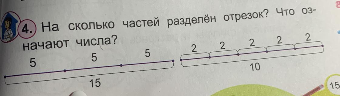 отрезок разделен на 1-три части, 2-пять части, т.е. 15:3=5;10:5=2.