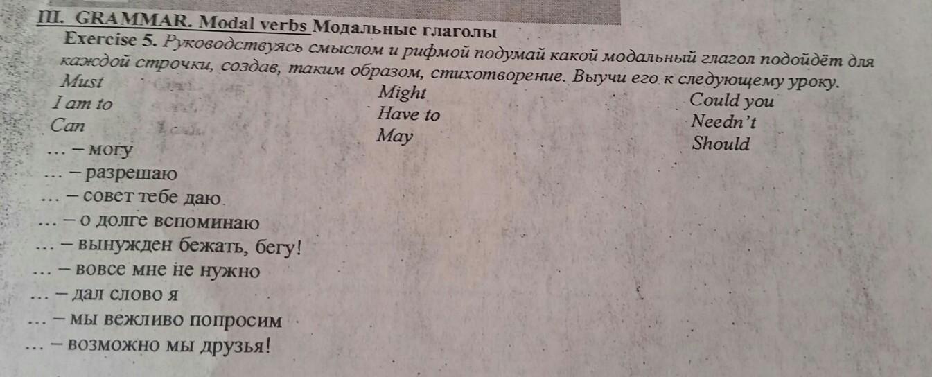 Exercise 5. Руководствуясь смыслом и рифмой подумай какой модальный глагол подойдёт для каждой строчки, создав, таким образом, стихотворение.