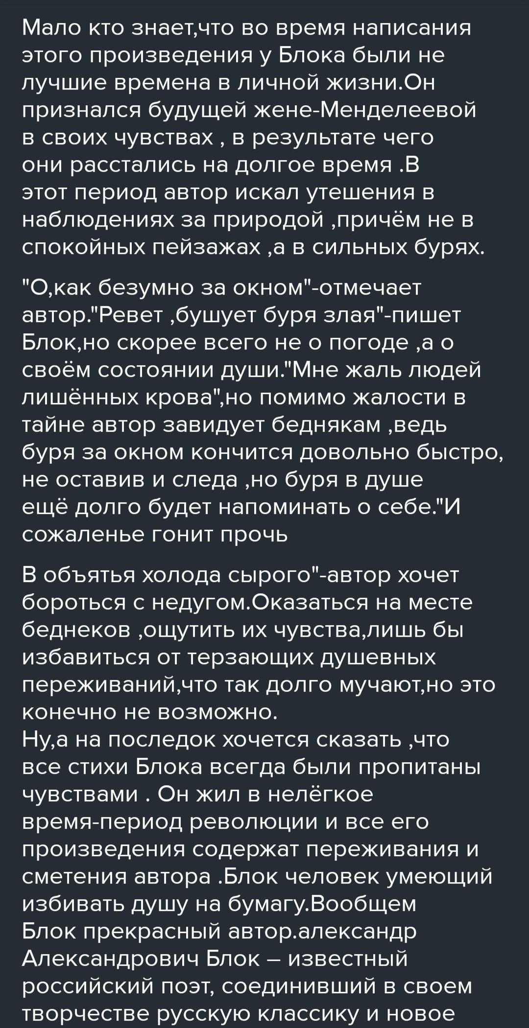 "О,как безумно за окном"-отмечает автор."Ревет ,бушует буря злая"-пишет Блок,но скорее всего не о погоде ,а о своём состоянии души."Мне жаль людей лишённых крова",но помимо жалости в тайне автор завидует беднякам ,ведь буря за окном кончится довольно быстро, не оставив и следа ,но буря в душе ещё долго будет напоминать о себе."И сожаленье гонит прочь
