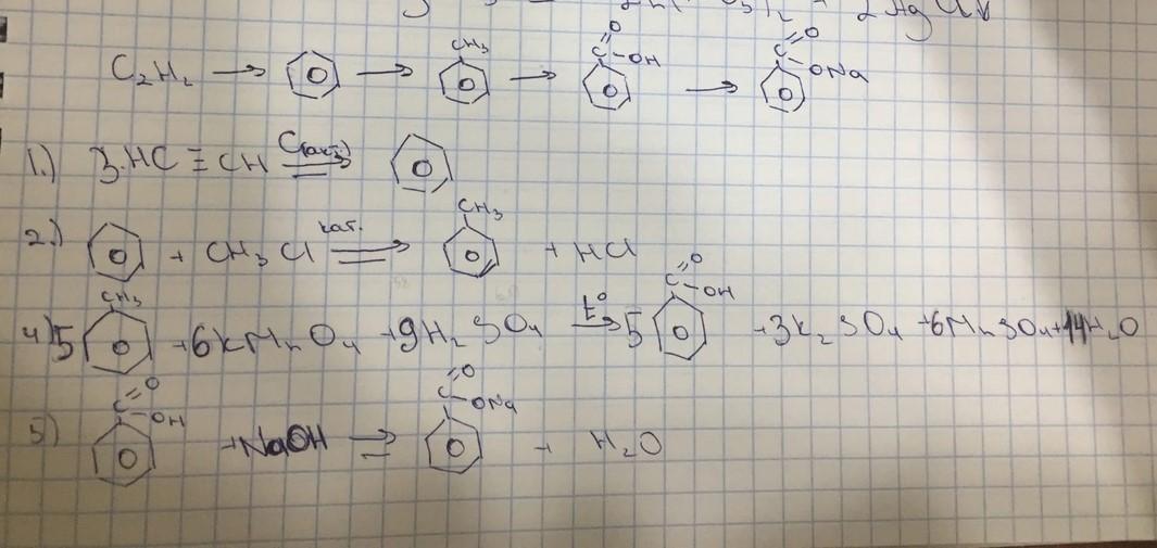 Напишите уравнения реакций, с помощью которых мож но осуществить следующие превращения. Укажите условия их про текания. Назовите вещества. C2H2 —> C6H6 —> C6H5CH3 —> C6H5COOH —> C6H5COONa.