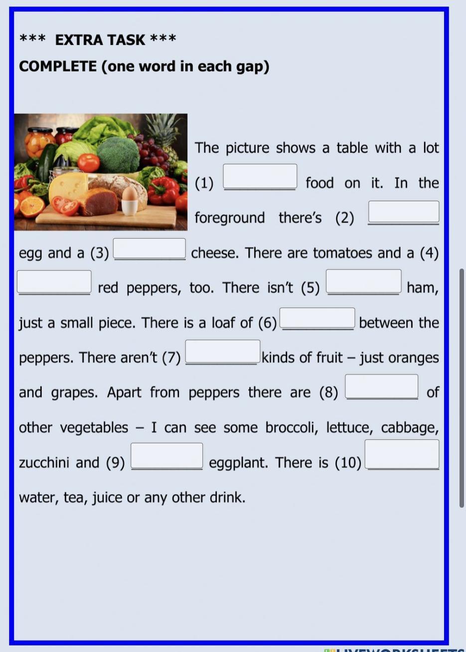 1) of food 2) an 3) - 4) orange 5) a 6) vegetables 7) any 8) lots 9) an