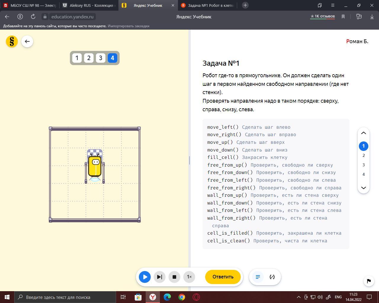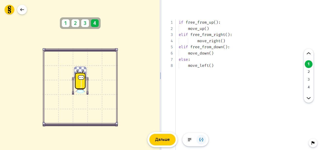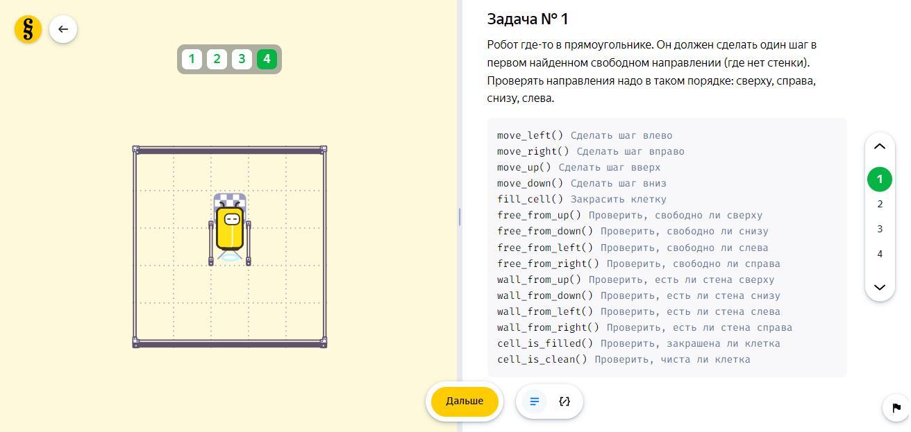 Робот где-то в прямоугольнике. Он должен сделать один шаг в первом найденном свободном направлении (где нет стенки).