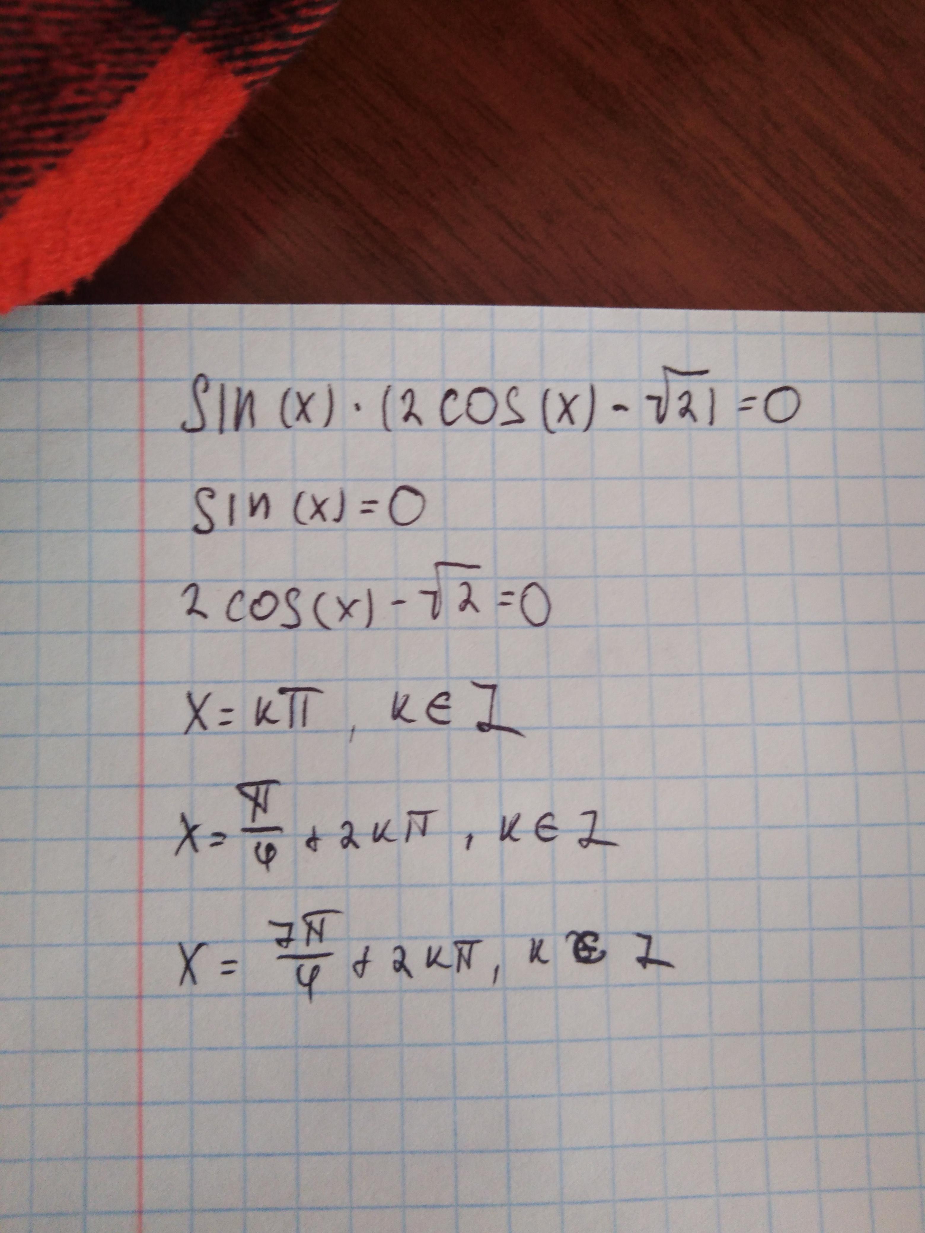 решите уровнение sin x(2cos x - корень 2)=0