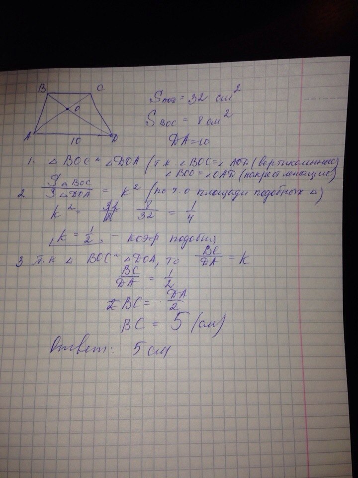 В трапеции ABCD(AD и BC основания)диагонали пересекаются в точке O, SAOD=32cм2 и SBOC=8см2.Найдите меньшее основание трапеции,если большее из нах=10 см