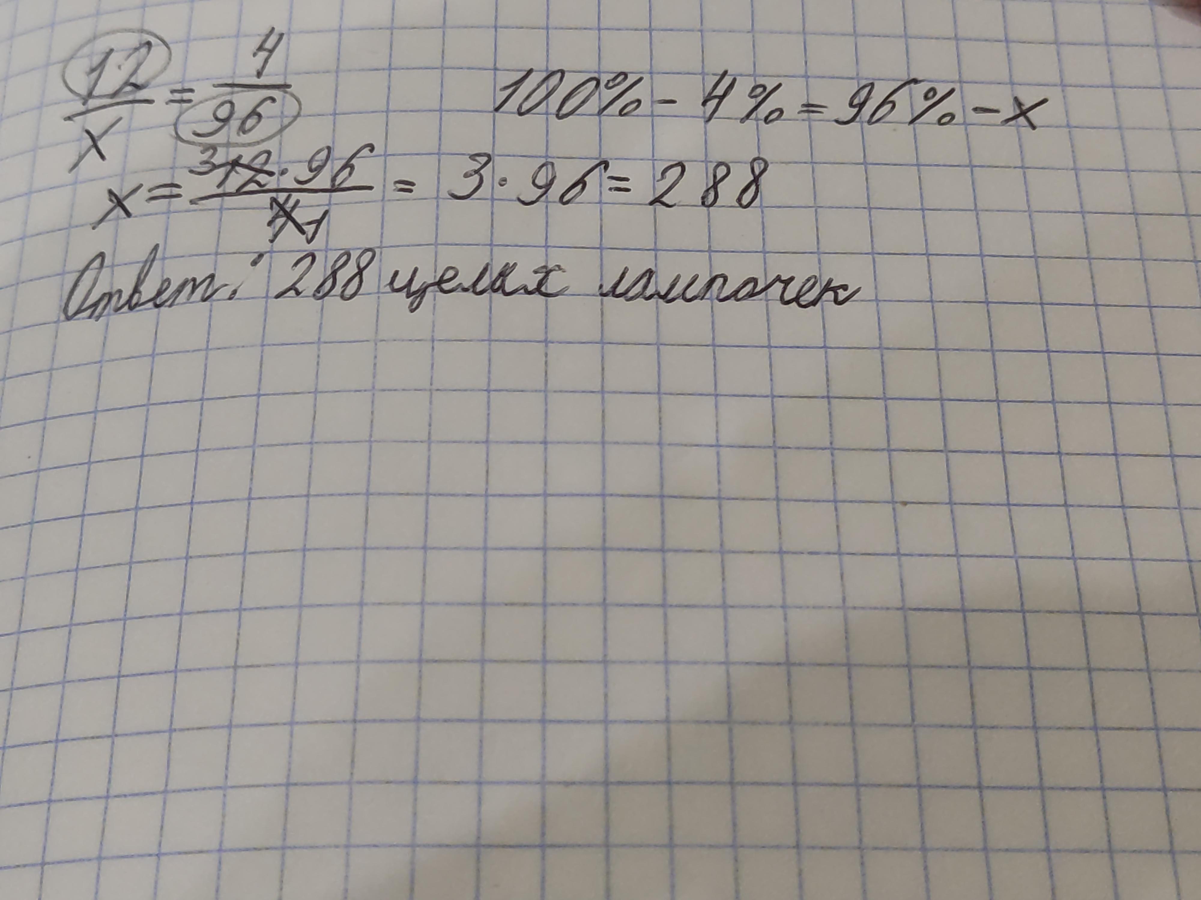 В коробке оказалось 12 бракованных лампочек,что составило 4% числа всех лампочек.Сколько целых лампочек было в корочке?решить в пропорции 12/х=4/96