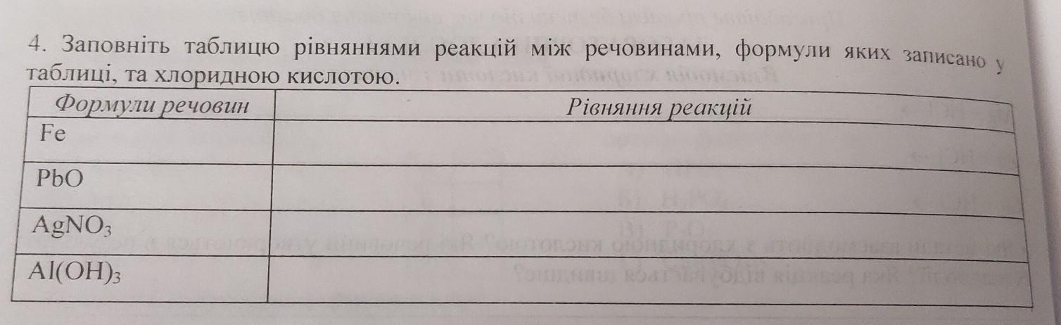 4. Заповніть таблицю рівняннями реакцій між речовинами, формули яких записано у таблиці, та хлоридною кислотою.