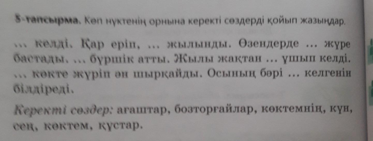 Көктем келді. Қар еріп, күн жылынады. Өзендерде сең жүре бастайды, ағаштар бүршік атты. Жылы жақтан құстар ұшып келді. Құсттар көкте жүріп ән шырқайды. Осының бәрі көктемнің келгенін білдіреді.