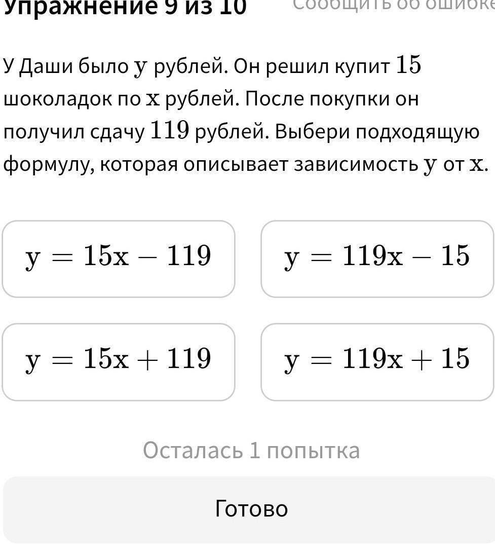 ПОМОГИТЕ ПОЖАЛУЙСТА,ВРЕМЯ ОГРАНИЧЕНО У Даши было y y рублей. Он решил купит 15 15 шоколадок по x x рублей. После покупки он получил сдачу 119 119 рублей. Выбери подходящую формулу, которая описывает зависимость y y от xx.