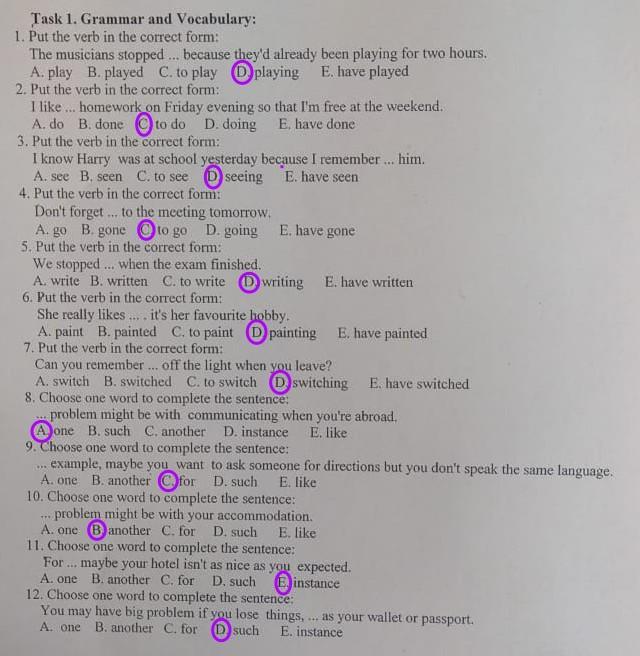 Task 1. Grammar and Vocabulary : 1. Put the verb in the correct form : The musicians stopped ... because they'd already been playing for two hours . D. playing A. play B. played C. to play D. playing E. have played Put the verb in the correct form : I like ... homework on Friday evening so that I'm free at the weekend . A. do B. done C. to do D. doing E. have done 3. Put the verb in the correct form : I know Harry was at school yesterday because I remember ... him . A. see B. seen C. to see D. seeing E. have seen 4. Put the verb in the correct form : Don't forget ... , to the meeting tomorrow . A. go B. gone C. to go D. going E. have gone 5. Put the verb in the correct form : We stopped ... when the exam finished . A. write B. written C. to write D. writing E. have written 6. Put the verb in the correct form : She really likes .... it's her favourite hobby , A. paint B. painted C. to paint D. painting E. have painted 7. Put the verb in the correct form : Can you remember ... off the light when you leave ? A. switch B. switched C. to switch D. switching E. have switched 8. Choose one word to complete sentence S problem might be with communicating when you're abroad . THAT A. one B. such C. another D. instance E. like 9. Choose one word to complete the sentence : 100 example , maybe you want to ask someone for directions but you don't speak the same language . A. one B. another C. for D. such E. like 10. Choose one word to complete the sentence : HE problem might be with your accommodation . A. one B. another C. for D. such E. like 11. Choose one word to complete the sentence : For ... maybe your hotel isn't as nice as you expected . A. one B. another C. for D. such E. instance 12. Choose one word to complete the sentence : You may have big problem if you lose things , ... as your wallet or passport . A. one B. another C. for D. such E. instance