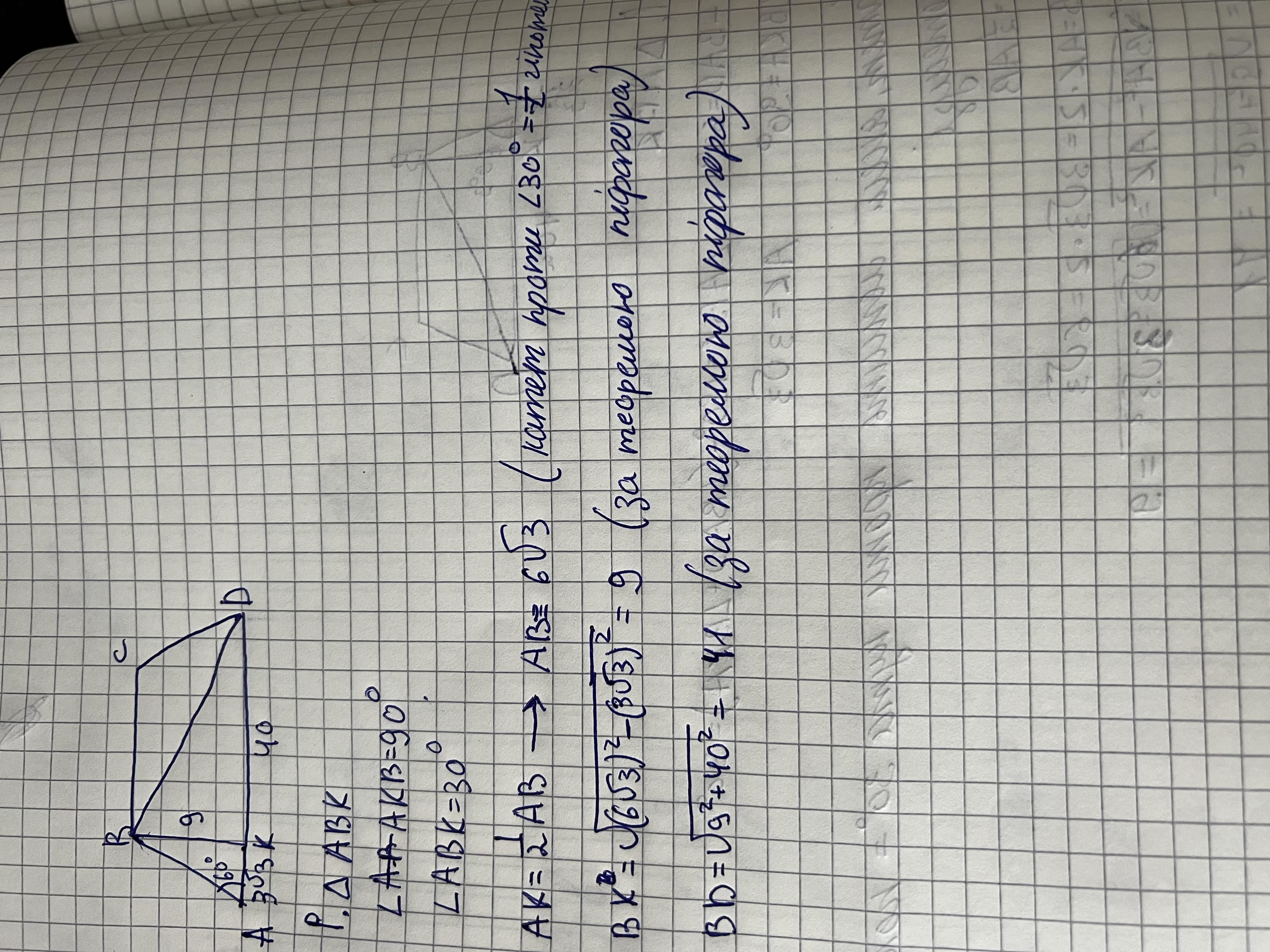 У трапеції ABCD кутBAD =60° висотаВК ділить основу на AD на відрізки 3√3 см і 40см. Згайдіть діагональ BD.