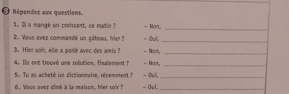 2. Vous avez commandé un gâteau, hier? - Oui,_________3. Hier soir, elle a parlé avec des amis ? - Non,________ 4. Ils ont trouvé une solution, finalement ? - Non,_______ 5. Tu as acheté un dictionnaire, récemment ? - Oui,__________ 6. Vous avez dîné à la maison, hier soir ? - Oui,__________