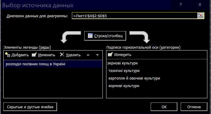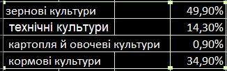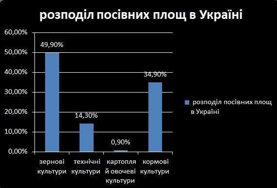 Побудуйте стовчасту діаграму розподілу посівних площ в Україні, якщо у середньому вони таки: 1) зернові культури - 49,9%; 2) технічні культури - 14,3%; 3) картопля й овочеві культури - 0,9%; 4) кормові культури - 34,9%