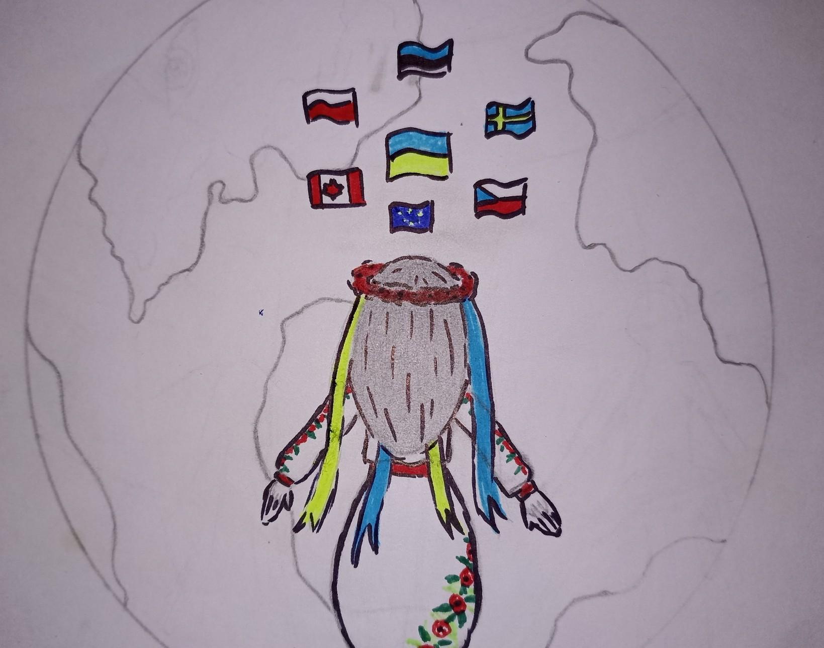 там потрібно намалювати жінку яка буде символізувати Україну та український народ, яка об'єднує всі країни (які її підтримують) і зрозуміло що прапорів може бути набагато більше